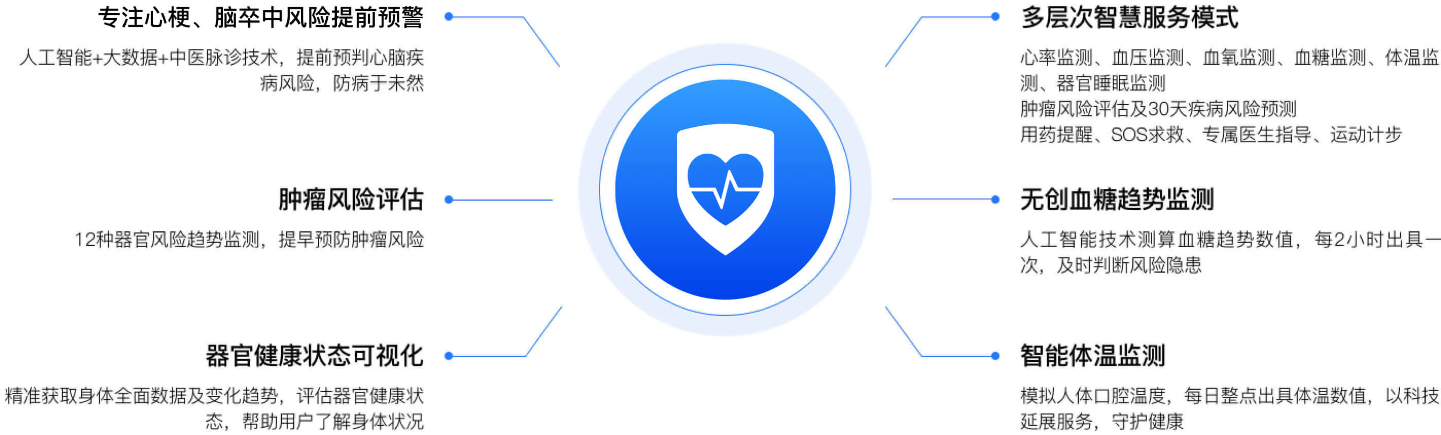 实时监测心率、血压、血氧饱和度,有氧运动模式监测,器官休息状态监测
